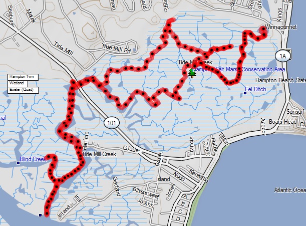 I went into the area between route 101 and Winnacunnet rd. I was going in and out the different water inlets. There were birds all around me. Some of the birds I could not identify. I did recognize blue herons, egrets, ducks, Black Scoter , the illustrious seagull, and other birds that I could not recognize. The birds seem scared of my red kayak (red in the animal kingdom means danger). The tide started going out and I was rowing against the current. As I was closer to Winnacunnet Rd. the current got stronger. I did not know there was a place for water to go out into the ocean on this side of the marshland. (opposite side away from the harbor). It was strenuous going against the current. I finally got to the point where I was rowing with the current. I got to where the car was but decided to go further to the harbor. The current became stronger as I near the harbor. I felt that I was being pulled in. I did not want to go into the harbor. I rowed back to the car after one small detour. As I saw the car I was glad that I parked where I did. The rocks indicated the level of the water at high tide stopped short by about 6 inches before the water would have approached the car. My arms were feeling it when I went ashore. Like normal I felt like I just felt satisfied.