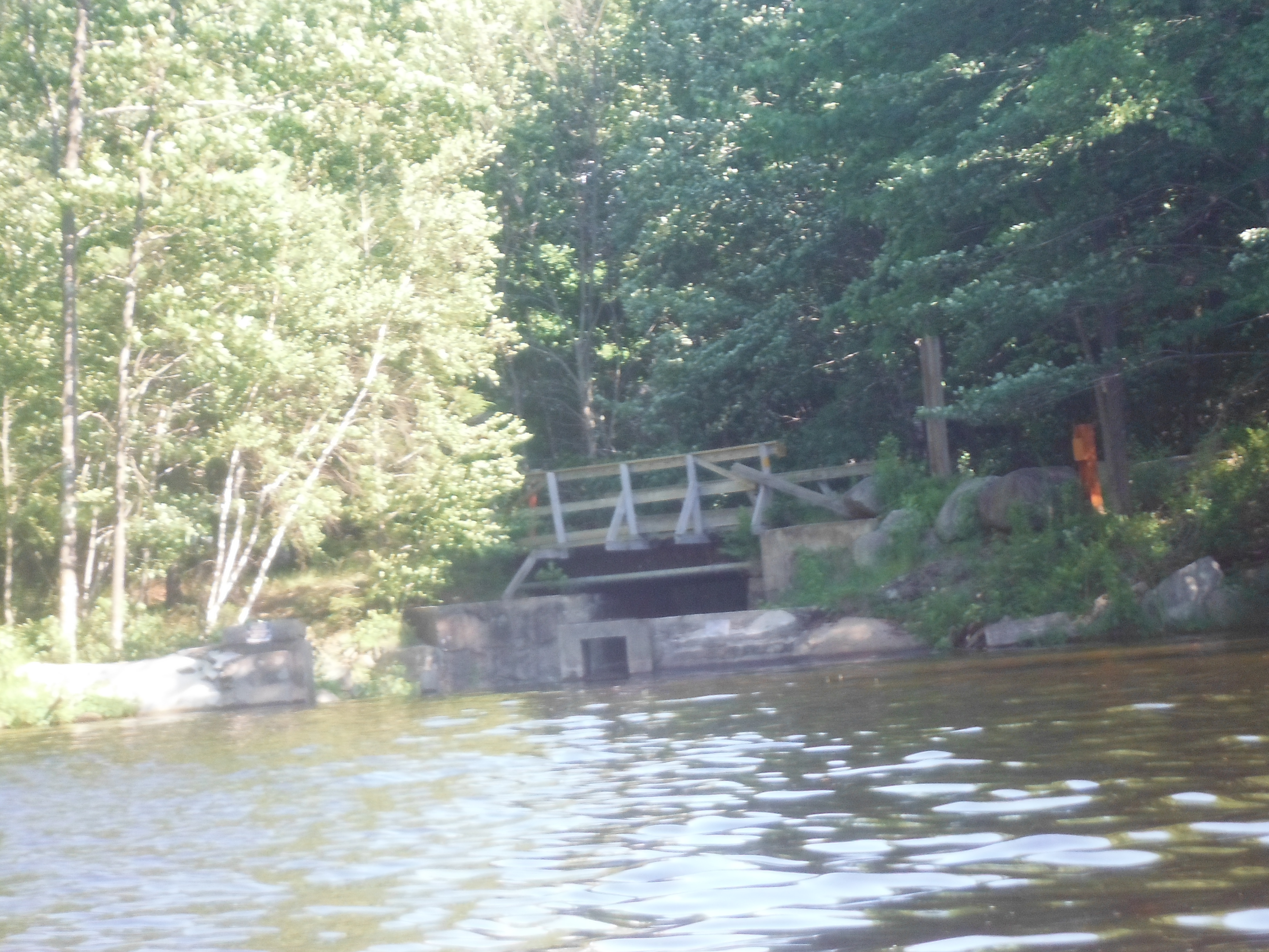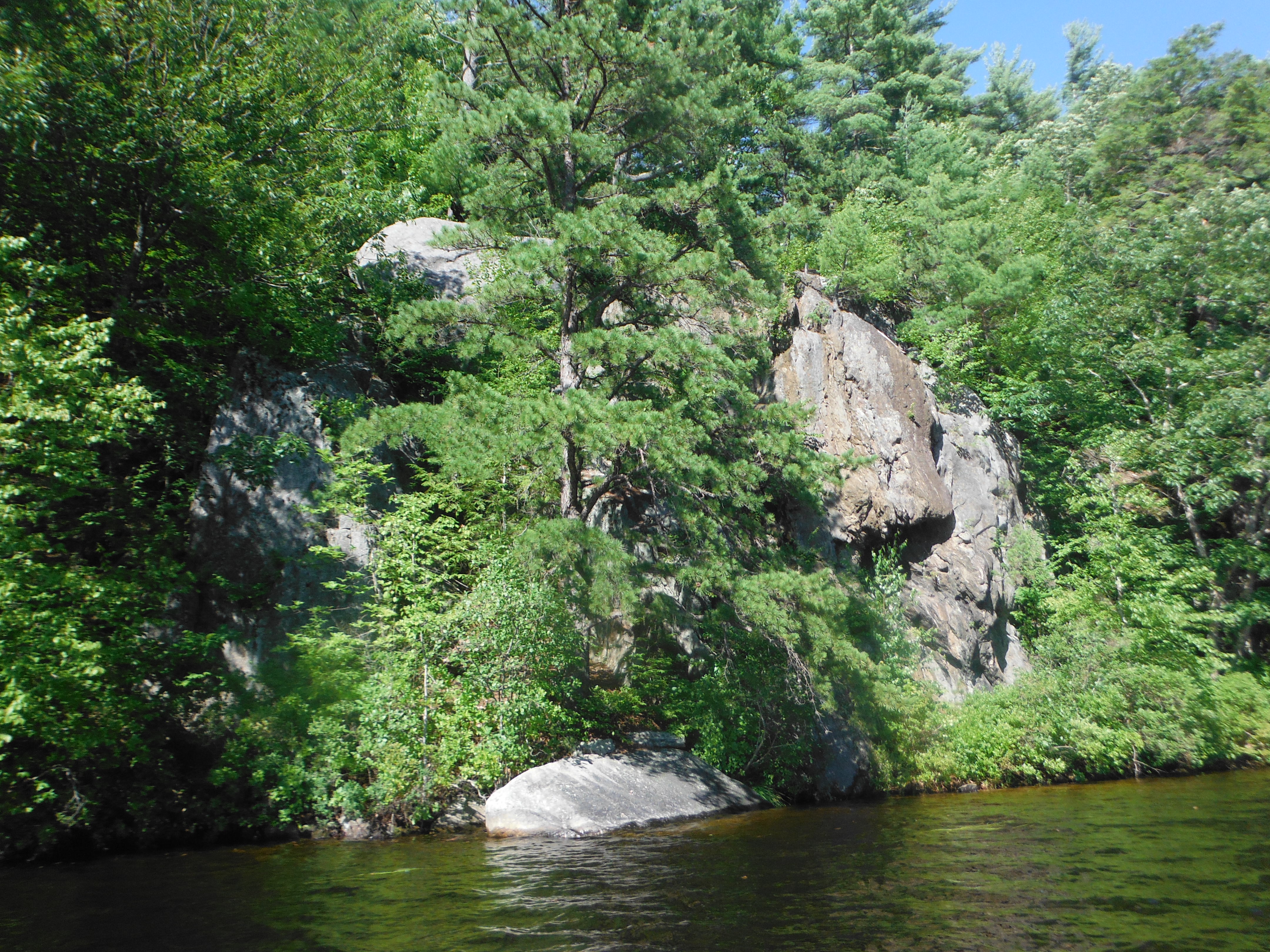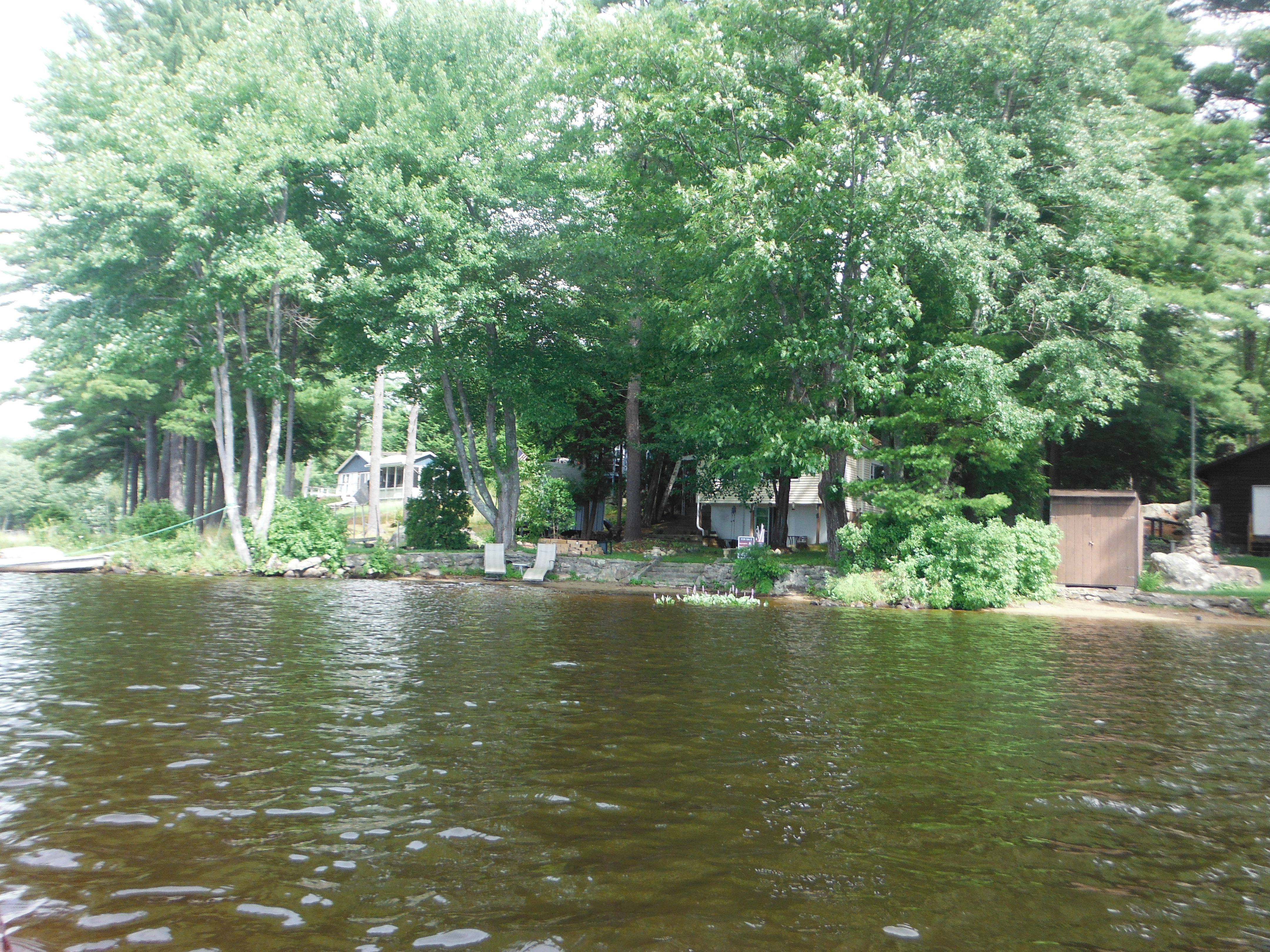 This was my second lake of the day.  While the first lake had problems parking, this lake had a place set aside by New Hampshire Park Department.  When I got on the lake, I did not see many large boats on the different docks like I saw on the other lake.  On the lake there was an island.  On one side it was  shallow with weeds.  It looked like one could walk from the shore to the island without swimming.  I was told that there was a pair of loons that had babies but didn’t see them.  It was a nice relaxing time going around the lake.  There was a number of rock crop ups along shore.  It was not a crowded lake.  When I got to the end there was a fisherman.  He was going out.  He said that he had always had good luck fishing here.  He said the biggest that he caught here was an eight pound large mouth bass.  All together it was a good time on this lake but I was getting hungry for supper.